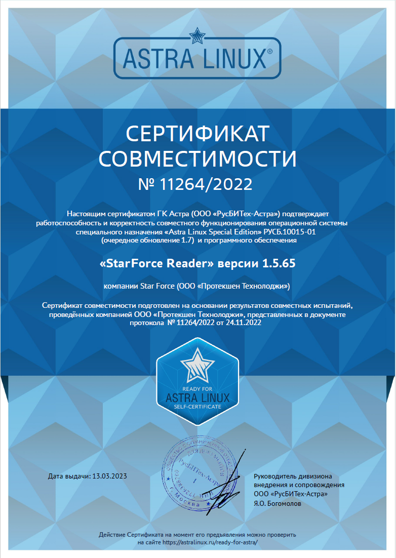 Настоящим сертификатом ГК Астра (ООО «РусБИТех-Астра») подтверждает работоспособность и корректность совместного функционирования операционной системы «StarForce Reader» версии 1.5.65 специального назначения «Astra Linux Special Edition» РУСБ.10015-01 и программного обеспечения. Сертификат совместимости подготовлен на основании результатов совместных испытаний, проведённых компанией ООО «Протекшен Технолоджи», редставленных в документе протокола № 11264/2022 от 24.11.2022.