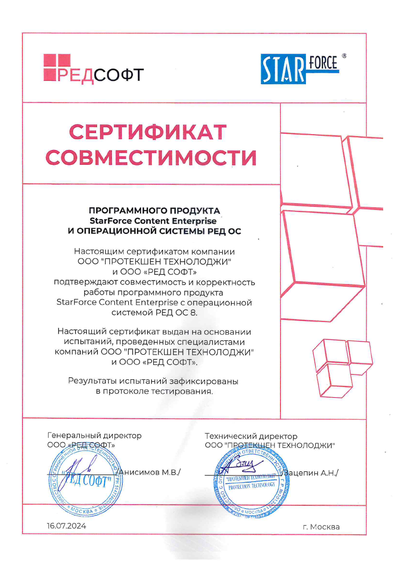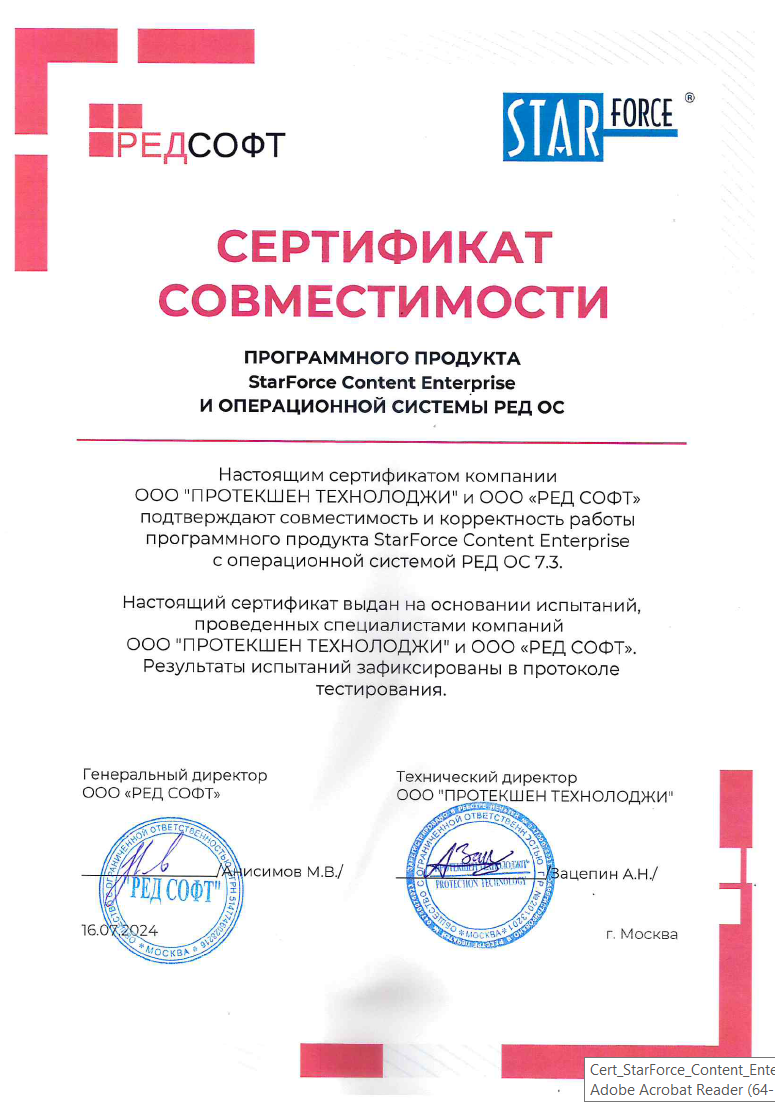 По результатам проведённых испытаний РЕД СОФТ компания «Протекшен Технолоджи» получила сертификаты соответствия, подтверждающие совместимость и корректность работы решения для защиты электронных документов от утечек StarForce Content Enterprise под операционными системами РЕД ОС 8 и РЕД ОС 7.3.